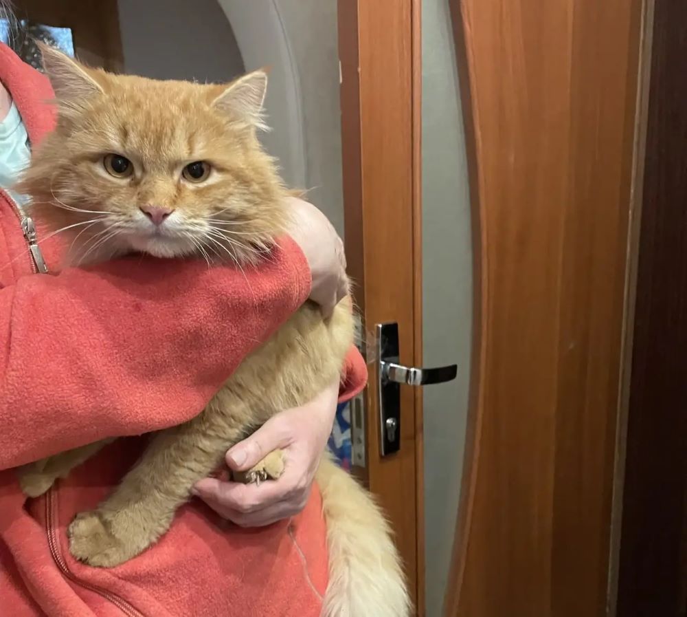 - 13 февраля я подъехал к своему дому 6/33 на улице Орджоникидзе, вышел и слышу очень жалкое мяуканье. Как у нас бывает, там кошки в подвалах живут, думаю, опять какой-то котенок появился. Подхожу к подъезду, между подъездом и входом в подвал сидит огромный кот, похожий на мейн-куна. Кот в ошейнике, видно, что домашний.