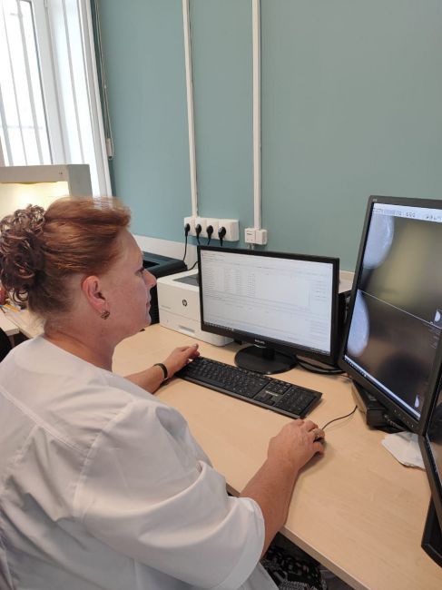 В поликлинике №1 описание маммограмм проводит врач-рентгенолог филиала №3 городской клинической больницы Ирина Сухинина. Она рассказала, что в день цифровую маммографию здесь проходят около 20 пациенток. В кабинете маммографии обследования выполняет рентген-лаборант, а врач-рентгенолог за своим компьютером занимается описанием снимков. Специалист отметила, что маммография проводится только по направлению и по предварительной записи, поэтому долгое ожидание исключено. Отдельно Ирина Геннадьевна остановилась на преимуществах цифрового оборудования: