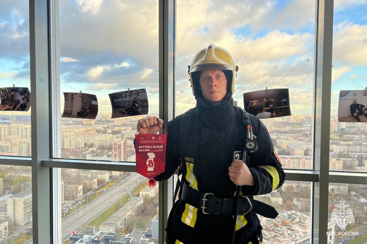 Владимир Князев в полной боевой экипировке преодолел дистанцию в 38 этажей за 7 минут 37 секунд.