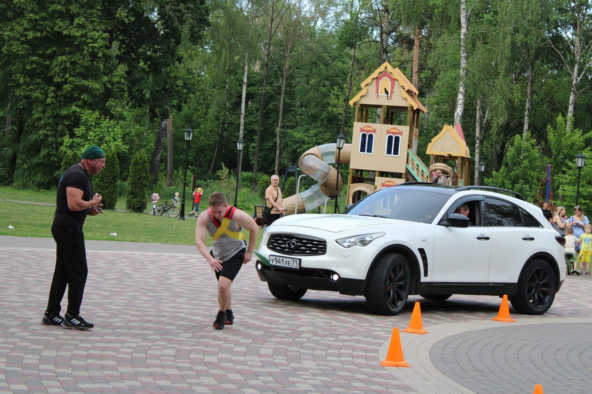 Ну а апофеозом и самым зрелищным упражнением фестиваля стала тяга вокруг фонтана тяжеленного автомобиля. Справились с этим все, но были здесь и свои лидеры, протянувшие тяжеленный автомобиль почти бегом.