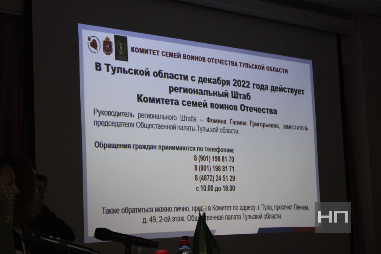 Галина Григорьевна обратилась к близким тех, кто сегодня выполняет главную задачу – «защищает суверенитет родной страны, кто борется за сохранение исторической памяти, которую неонацисты хотят вырвать из наших душ, памяти, которую создавали поколения победителей». Сообщила она и о том, что Комитет семей воинов Отечества располагается в одном помещении с Общественной палатой Тульской области, и там всегда готовы помочь родным и близким воинов в трудной жизненн ой ситуации.
