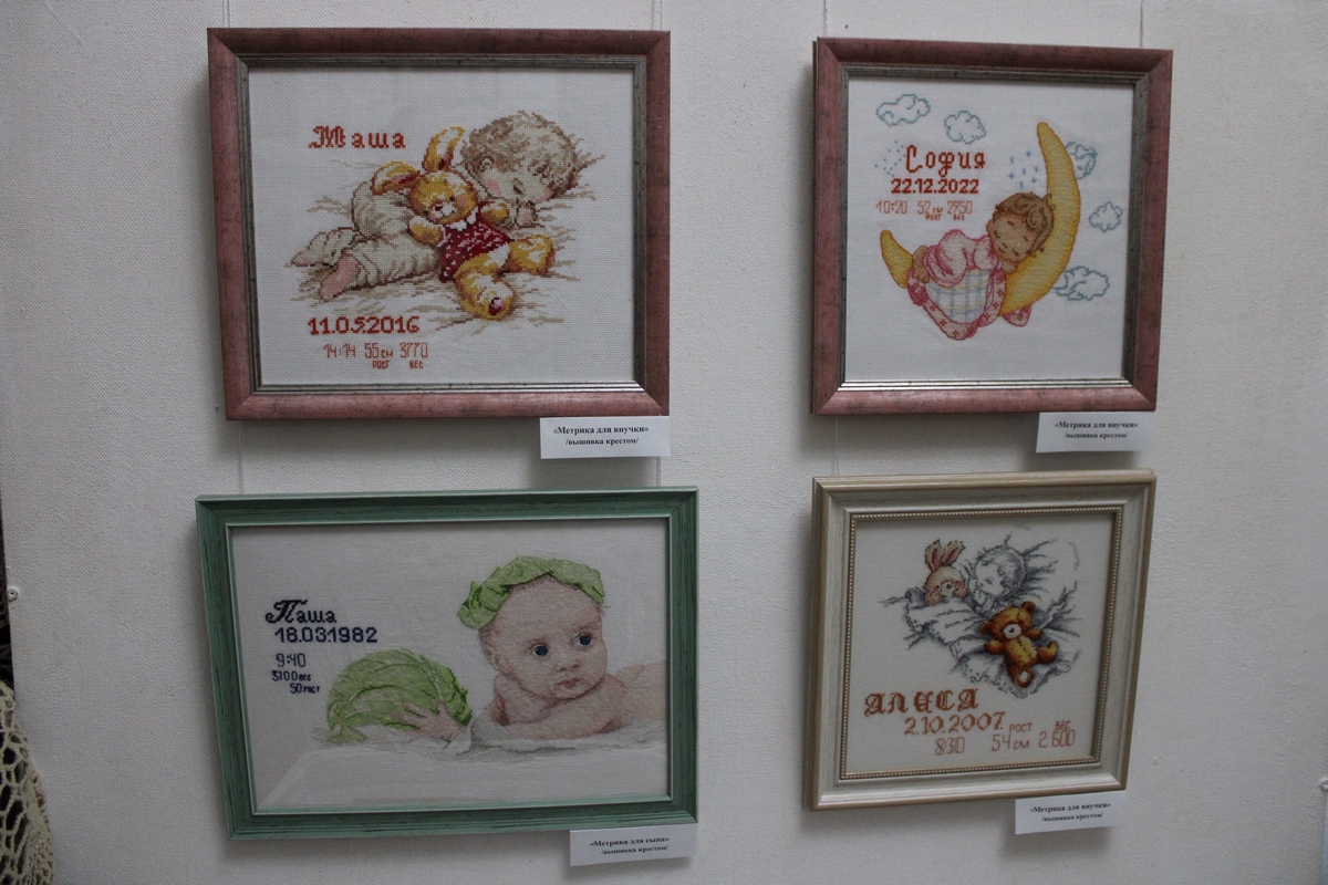 В экспозиции представлены работы различной тематики - это и копии картин известных художников, такие как «Итальянский полдень» Карла Брюллова, «Девушка с жемчужной сережкой» Яна Вермеера, «Шоколадница» Жана Лиотара и др., а также пейзажи, натюрморты, небольшие композиции различной тематики, в том числе и необычные вышитые метрики для сына и внуков.