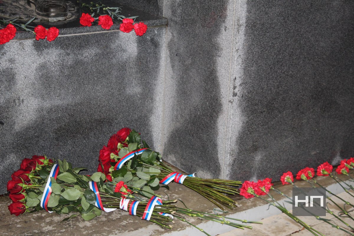 Началась церемония открытия с минуты молчания и возложения цветов к памятнику, посвященному героическим защитникам города.