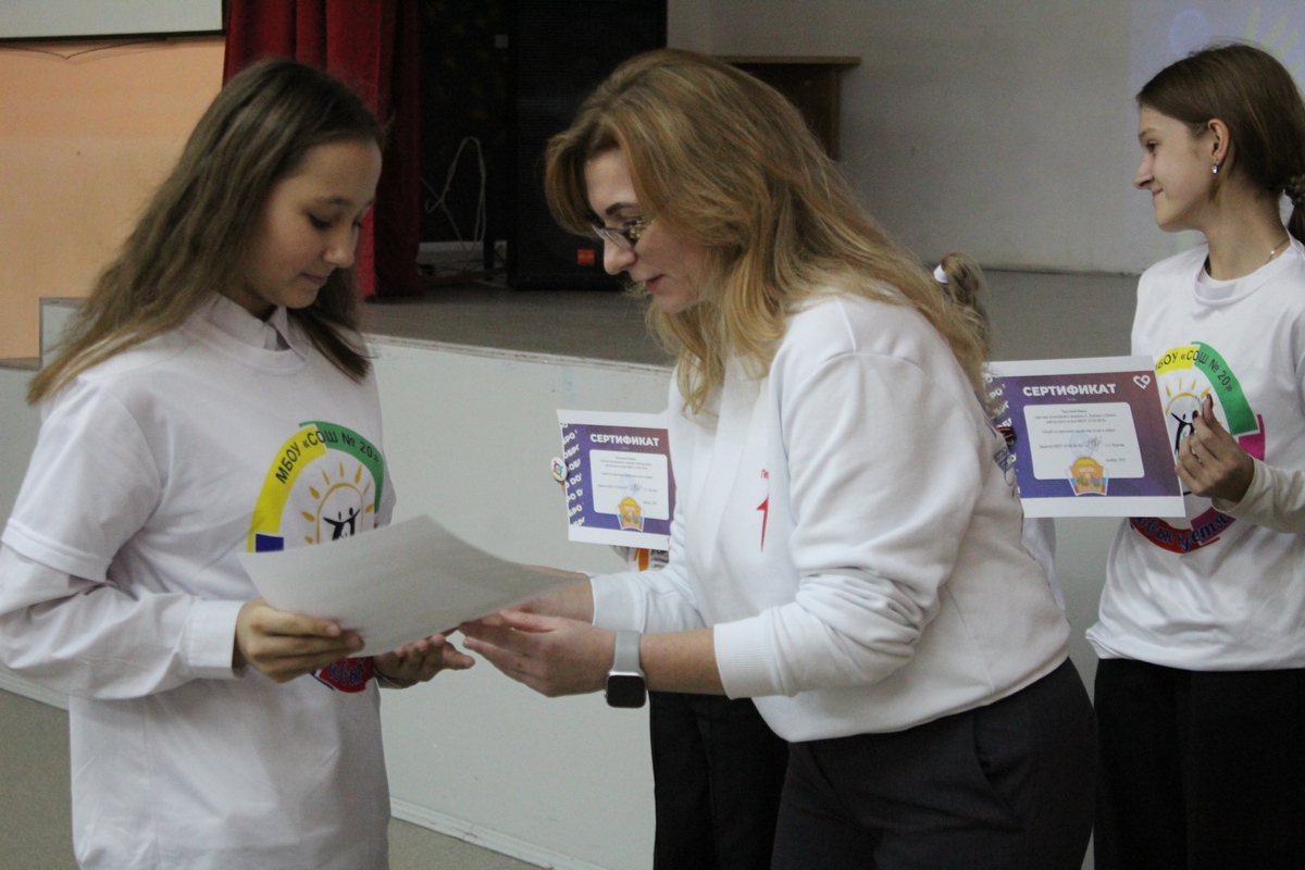 - Я вам желаю не останавливаться на достигнутом, двигаться всегда только вперед, всегда приходить на помощь ближнему и тому, кто в этом нуждается, - пожелала она и вручила школьникам Благодарности за значительный вклад в развитие добровольческого движения, высокий творческий потенциал, инициативность, неиссякаемую жизненную энергию, готовность прийти на помощь в трудную минуту, а новым участникам волонтерского движения школы – волонтерские значки и сертификаты.