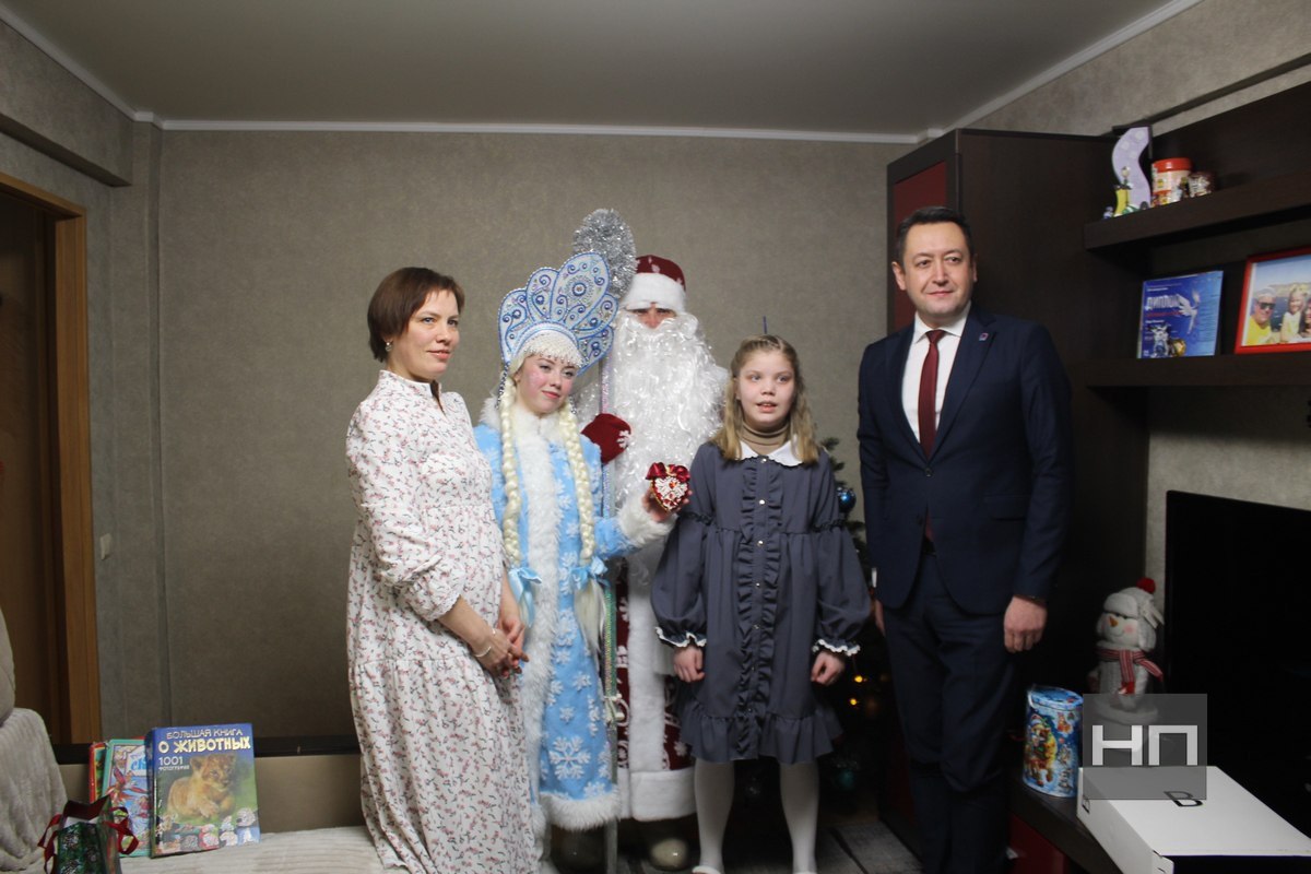 В дверь семьи Фомичевых позвонили гости – Дед Мороз и Снегурочка. А вместе с ними пришел глава администрации Новомосковска Руслан Бутов, и принес, удивив всю семью, очень большой подарок – коробку с новогодним конструктором.