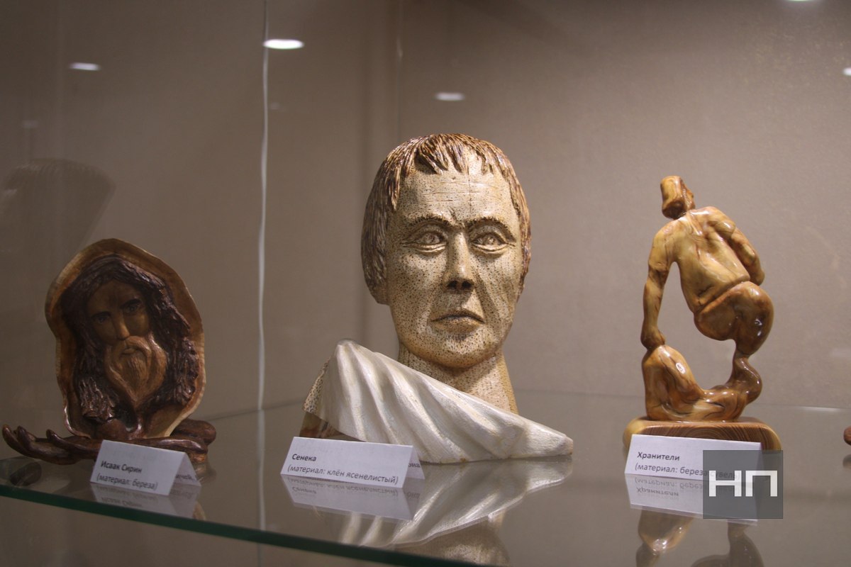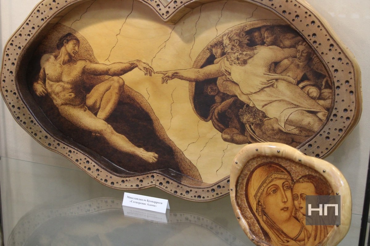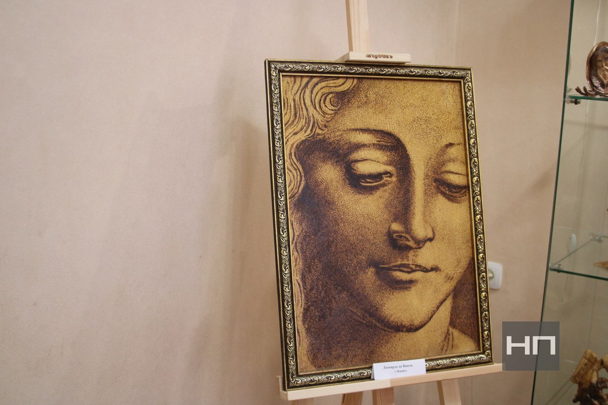 И вот – новая экспозиция, демонстрирующая многие таланты автора. Здесь можно увидеть и миниатюрные деревянные скульптуры, и копии картин великих мастеров живописи, выполненные в технике пирографии (выжигания). И хотя Сергей не имеет профессионального художественного образования, его работы показывают, насколько хорошо он владеет рисунком. И как мастерски «перекладывает» на язык графики цветные в оригинале произведения живописи, оперируя тонкими тонами и полутонами.